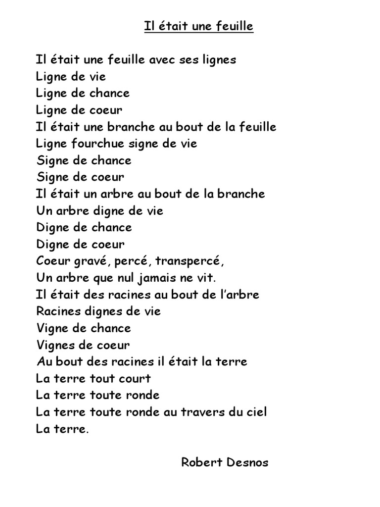 Il était une feuille Voir la pièce jointe 18123 Il était une feuille avec ses lignes Ligne de vie Ligne de chance Ligne de cœur Il était une branche au bout de la feuille Ligne fourchue signe de vie Signe de chance Signe de cœur Il était un arbre au bout de la branche Un arbre digne de vie Digne de chance Digne de cœur cœur gravé. Il était une feuille Il était une feuille avec ses lignes Ligne de vie Ligne de chance. Poésie de Il était une feuille au Cm2 - Lecture compréhension Il était une feuille Il était une feuille avec ses lignes Vignes de chance Lignes de vie Vignes de cœur Lignes de chance Au bout des racines il était la terre Lignes de cœur La terre tout court Il était une branche au bout de.