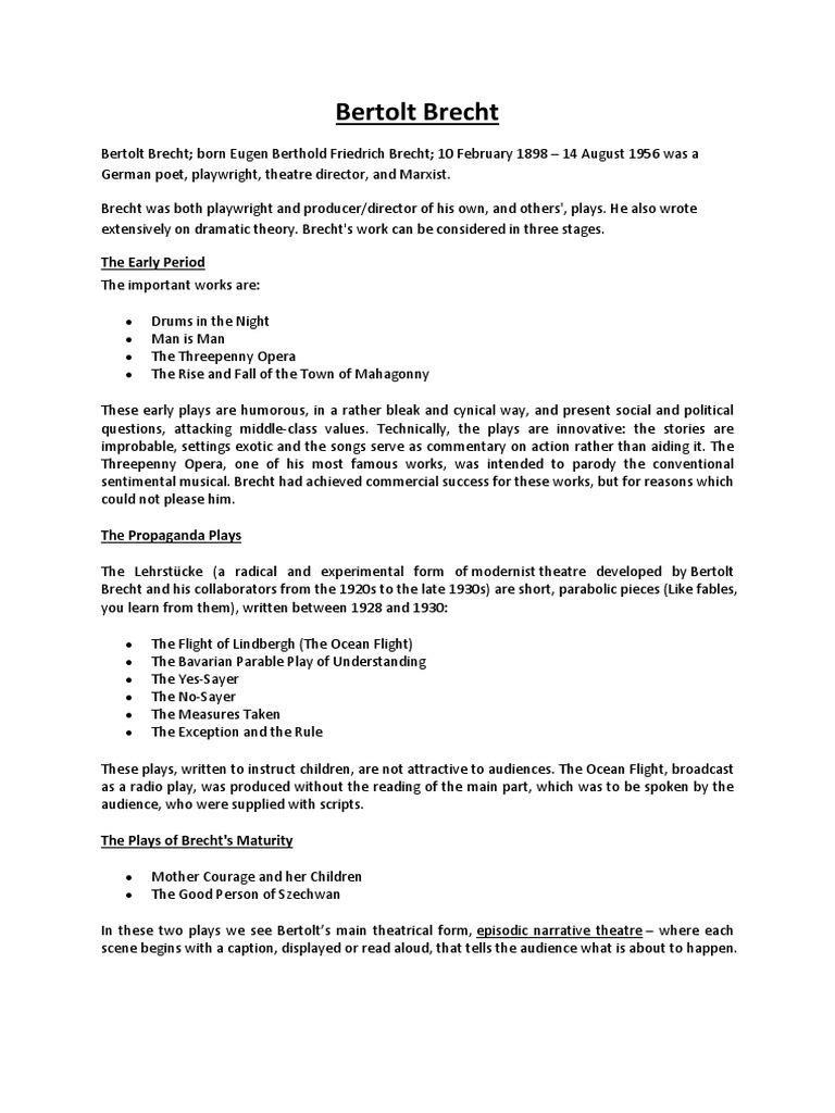 Il défend la conception dun théâtre épique défini par sa fonction sociale et politique. Nhésitez donc pas à revenir régulièrement. Issu dune famille bourgeoise Bertolt Brecht commence ses études à Munich en 1917 à la faculté de lettres puis de.